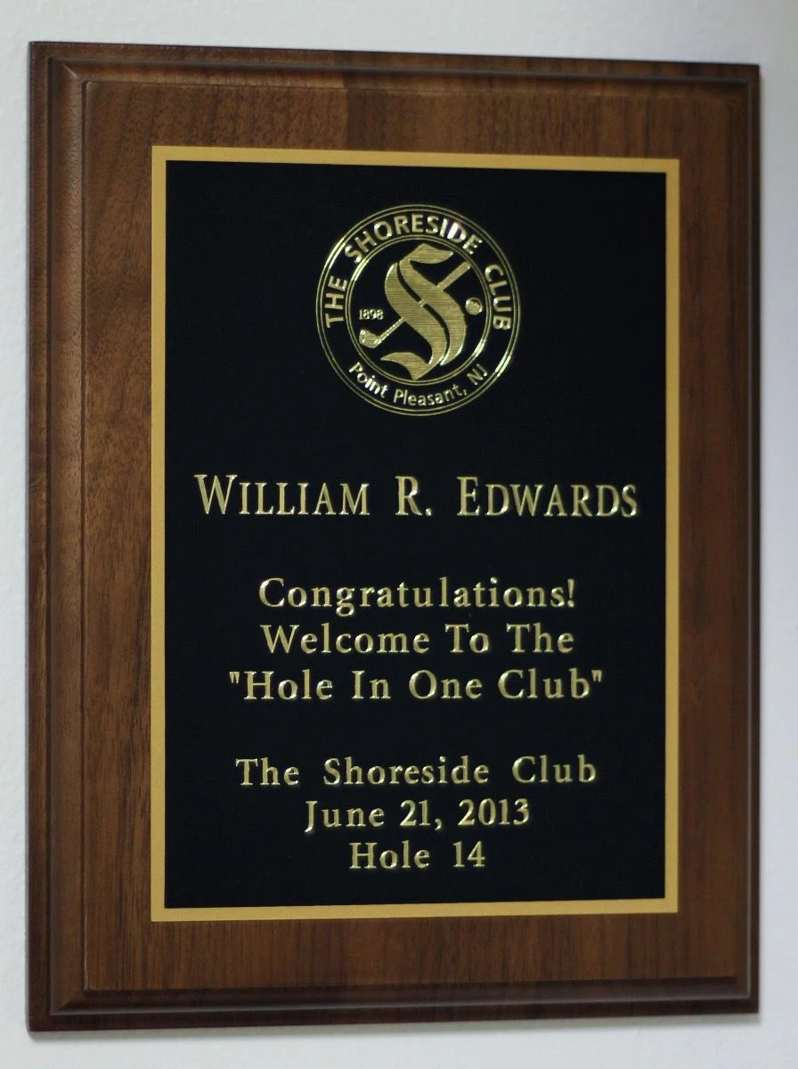 You have two choices of wooden plaques. This 8 x 10″ plaque is made of solid walnut. The other choice is rosewood veneer. Both have a 6 x 8 inch plate for your personalization. You get 75 free characters. Logo can be added for a fee. Additional characters are OK at 15 cents per character.