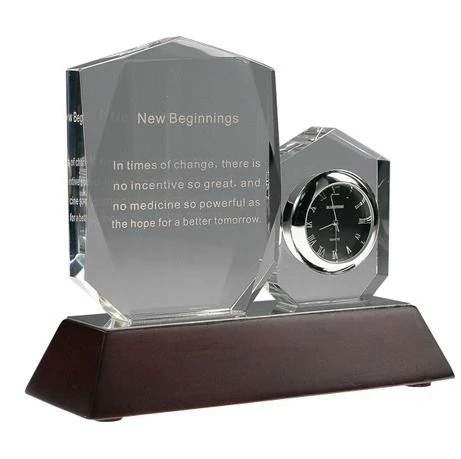 Stay Positive! Words are beautifully etched on the larger crystal tablet. The clock is embedded in the smaller crystal. The base is made of black crystal. Personalization is possible with a plaque on the base.