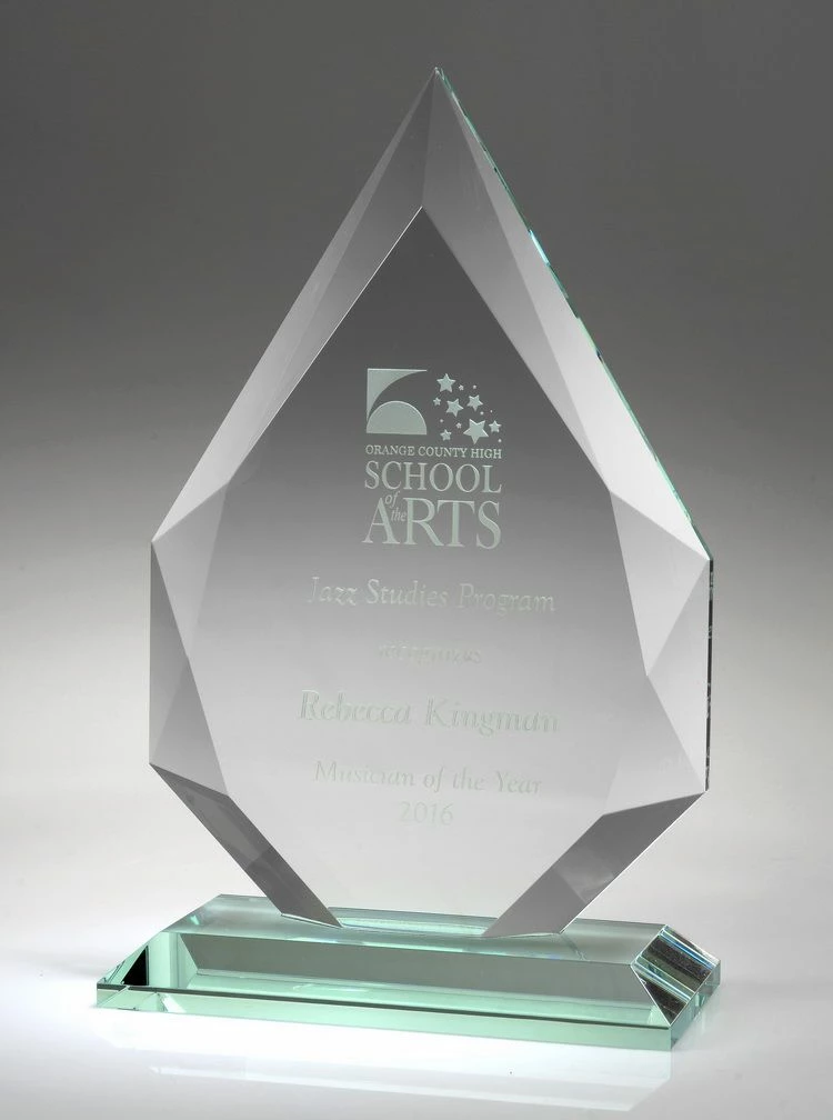 Made of jade glass instead of optical crystal. This is the less exprensive version of the Apex Award. You also save money by it arriving in a deluxe box, not a presentation box. This style is available in 3 sizes. Select size – request personalization.