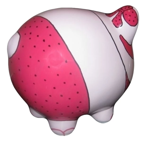 This ceramic piggy bank is wearing a polka dot bikini and looking very sheek in her pink sunglasses. Even her toenail polish coordinates with her bikini top and sunglasses.