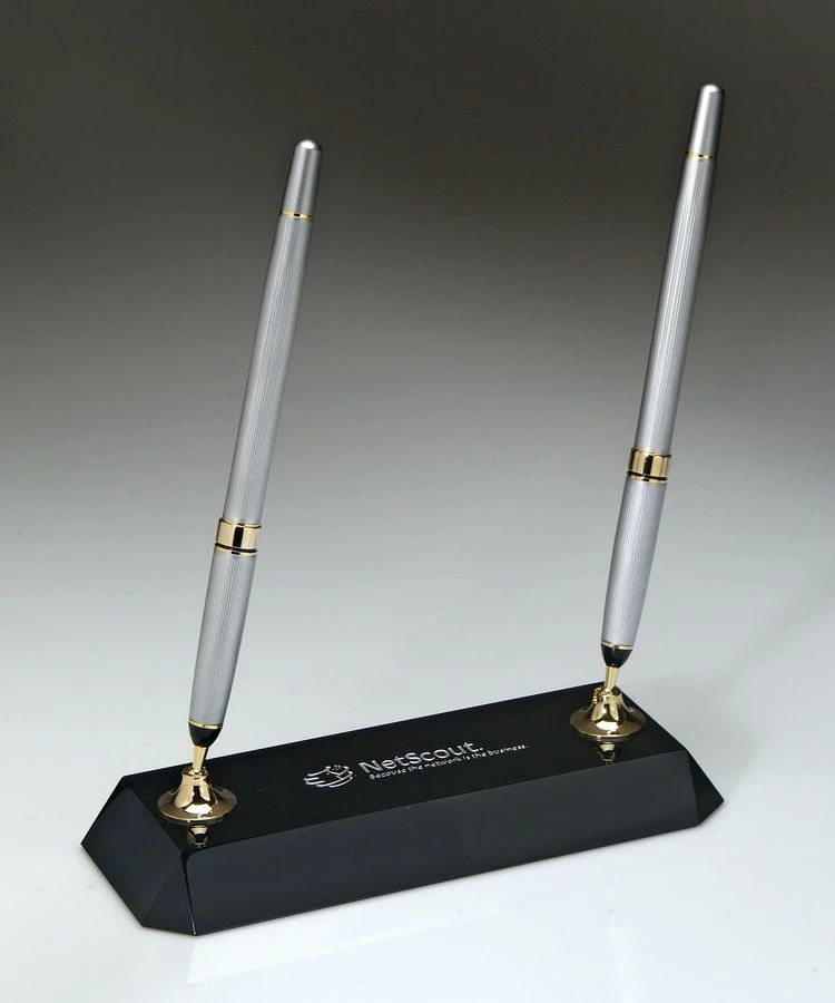 The Black Crystal Pen Set has two pens. Designed to match any surface you put it on. You can customize pen set by personalizing on top of base between two pens.