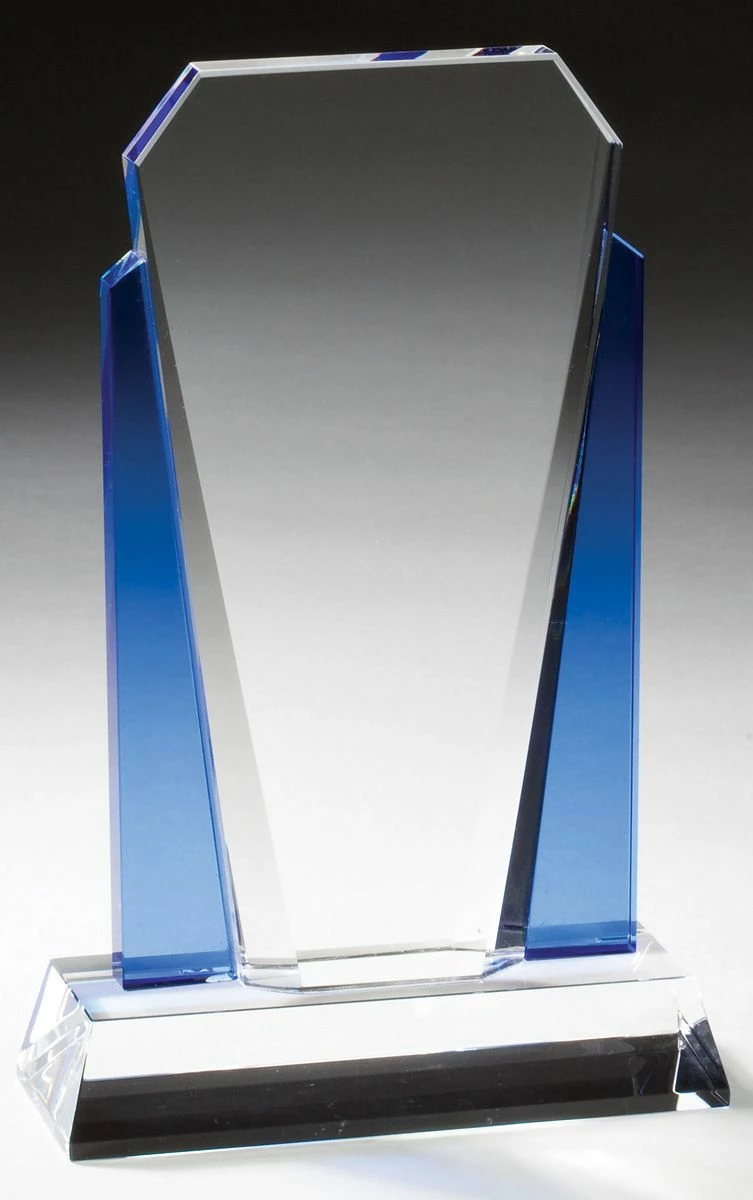 If your team or firm uses blue as it’s color, this is a perfect award for you! Made of clear crystal. Even the blue part is made of crystal. Since the personalization area is larger at the top than the bottom, the imprint area is 3-1/2 inch at top, 2-3/4 in center, 1-1/2 inch at bottom with a height of 8 inches.
