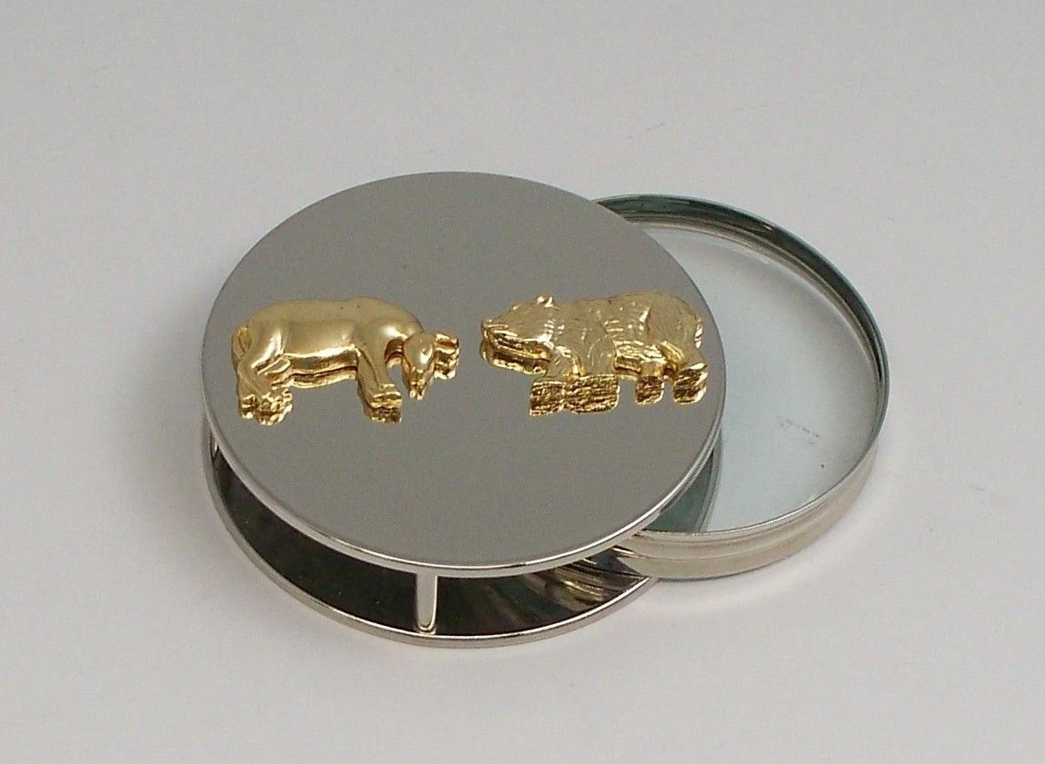 Bull and Bear Magnifying Glass and Paperweight. It’s a hidden magnifying glass! Yes, this desk item looks like a bull and bear paperweight – then it opens and it is a magnifying glass. You have a two-fer!  Looks like Silver – its chrome plated surface is tarnish proof.