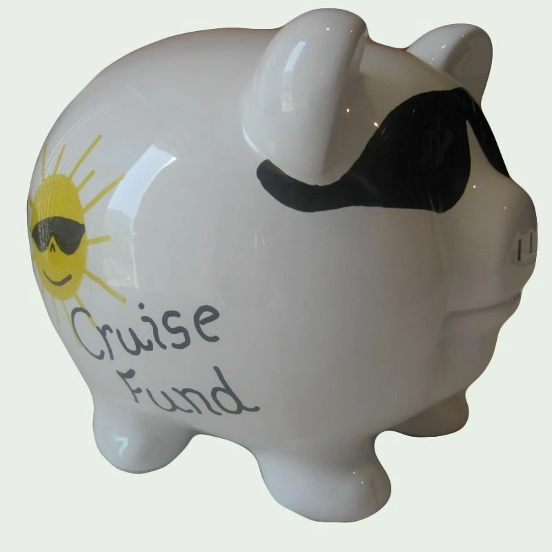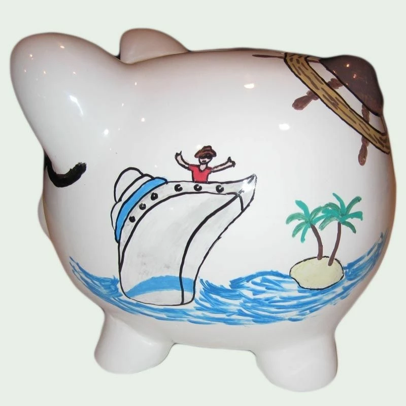 This Cruise Fund is an Artist Original Piggy Bank created by Debbie exclusively for us. Â If there is a group that wants to cruise together, Debbie can make a bank for each person.