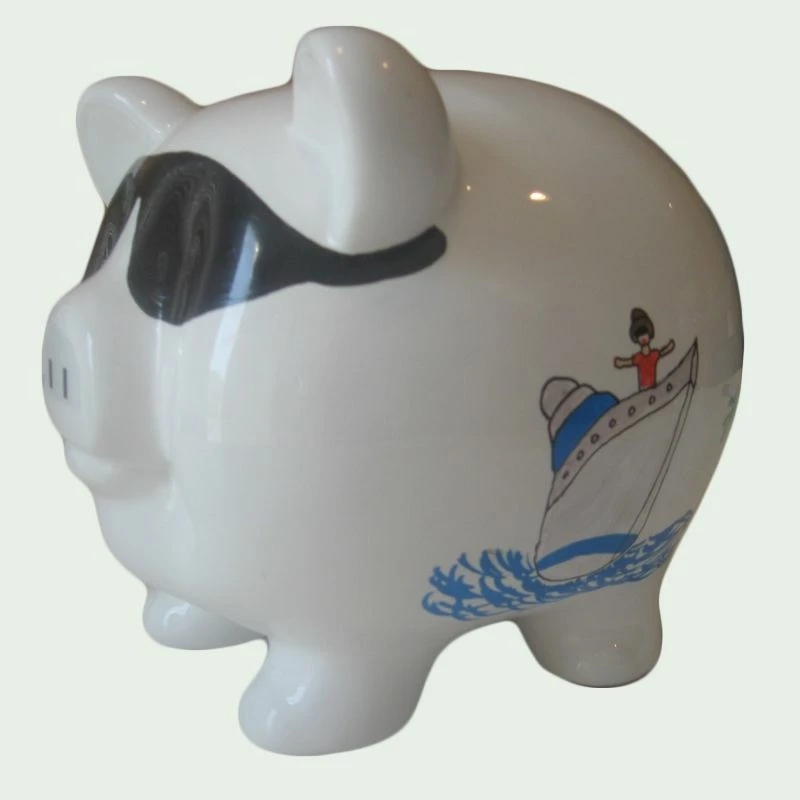 Check out all four images. On one side is the bow of the cruise ship amidst the ocean. On the other side are the words Cruise Fund. We can add a name to this so it would say Jack’s Cruise Fund. The face of the cruise fund piggy bank has a dark pair of shades – I guess even an Alaska Cruise can have sun. Made of ceramic on a 8 inch white classic piggy bank.