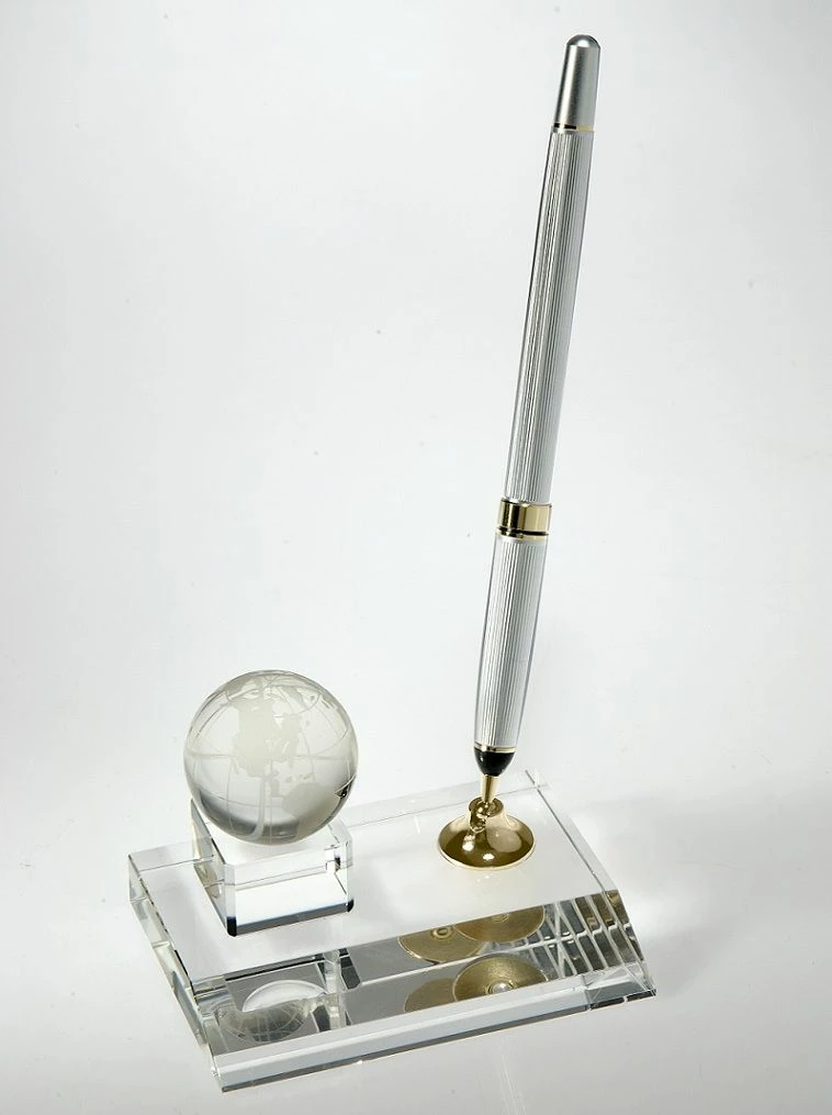 A crystal stand holds a golf ball and a business card holder. The golf ball can be removed The rectangular crystal stand has a beveled front for extra sparkle. The front of the base of the pen set can be personalized. Crystal Golf Business Card Holder Pen Set comes in a presentation box lined with satin. The pen and pen holder have a subtle, striped sheen with gilt accents.