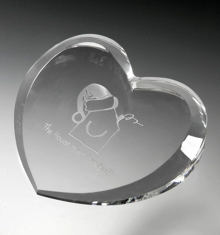 Crystal Heart Paperweight. Heartfelt thanks for a job well done! This crystal paperweight has faceted edges for a smooth look and has plenty of unobstructed space to personalize this piece with a corporate logo, a monogram, or a personal message. The heart paperweight is wrapped in satin and shipped in a nice presentation box.