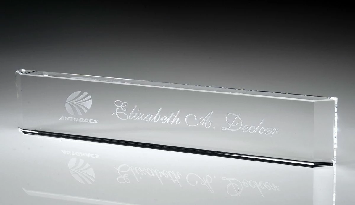A crystal name plate is twelve inches long and two and a quarter inches tall.