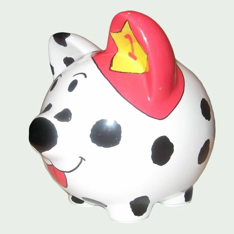 Debbie, our artist, who created this Dalmatian piggy bank exclusively for us certainly relates to this piggy bank. Her husband is a fireman. And firemen love their Dalmatians! Debbie did a great job of incorporating both themes – the dog and the fireman – into this fireman artist original piggy bank.