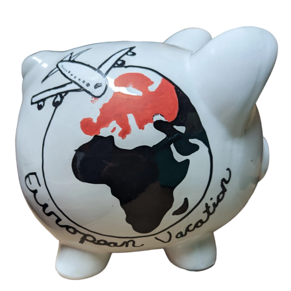 On the right side of the piggy bank you can see an airplane flying in the air over the Earth heading towards Europe. Underneath the globe you can see “EUROPEAN VACATION” hand painted in black ink. Our artist will gladly change the words for you. It could say PARIS vacation or your choice.