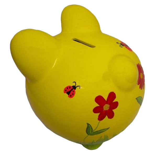 Flowers and lady bugs abound on this bright yellow piggy bank.