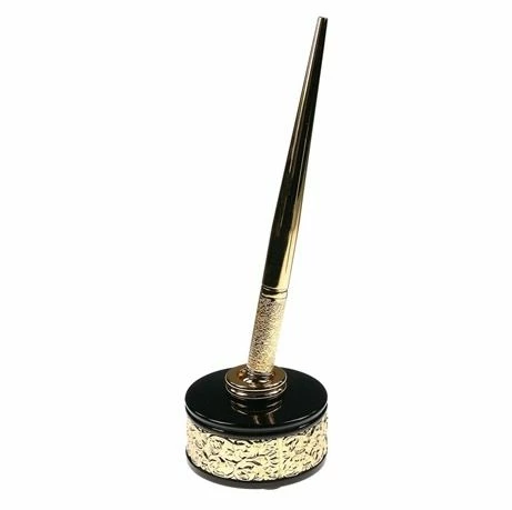 The side of the base is decorated with gold filigree. Black laquered top of metal base. Quite distinguished.Â
