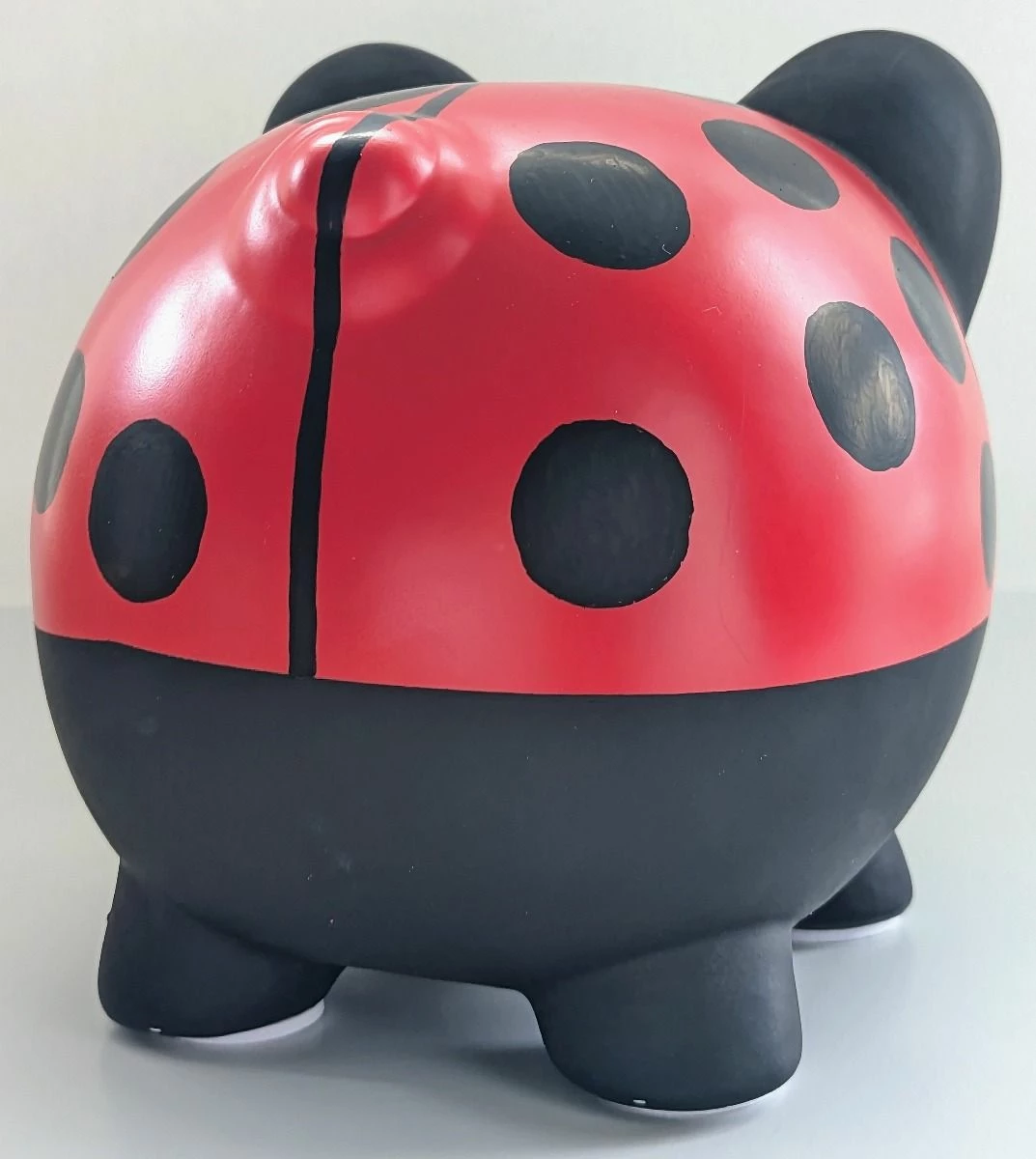 This ceramic piggy bank has been transformed into a lady bug. An adorable lady bug with huge eyes.