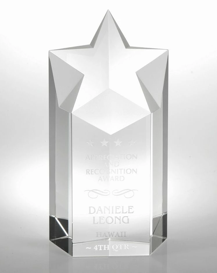 Like a Star is made of optical crystal. It is a beautiful piece. As a child a gold star was a symbol of achievement. Even today a star still symbolizes achievement. We’ll help you make this award very special.