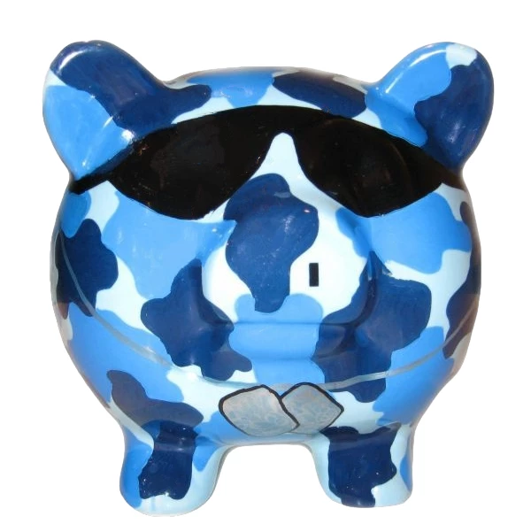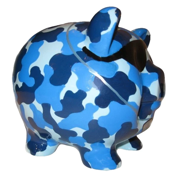The camouflage piggy bank is painted on an 8 inch ceramic pig. The camouflage colors are done in three shades of blue. This blue camouflage design is a Navy design. Look closely at the 3 images and you will see that this Navy influenced piggy bank has dogtags around its neck and is wearing sunglasses!Â