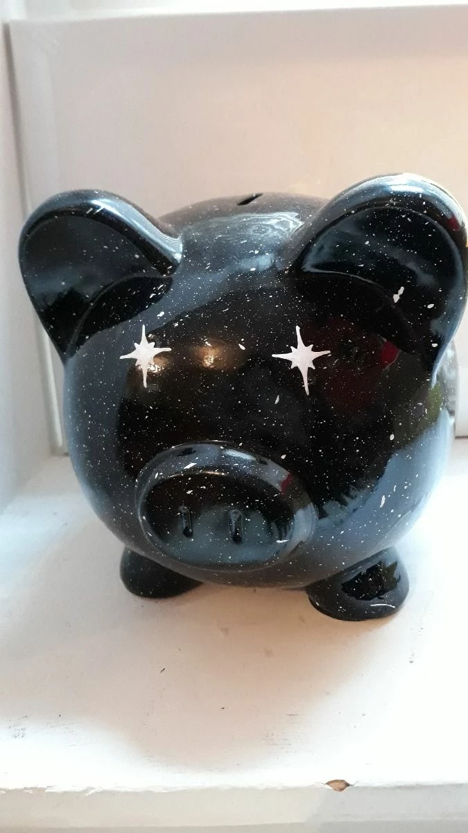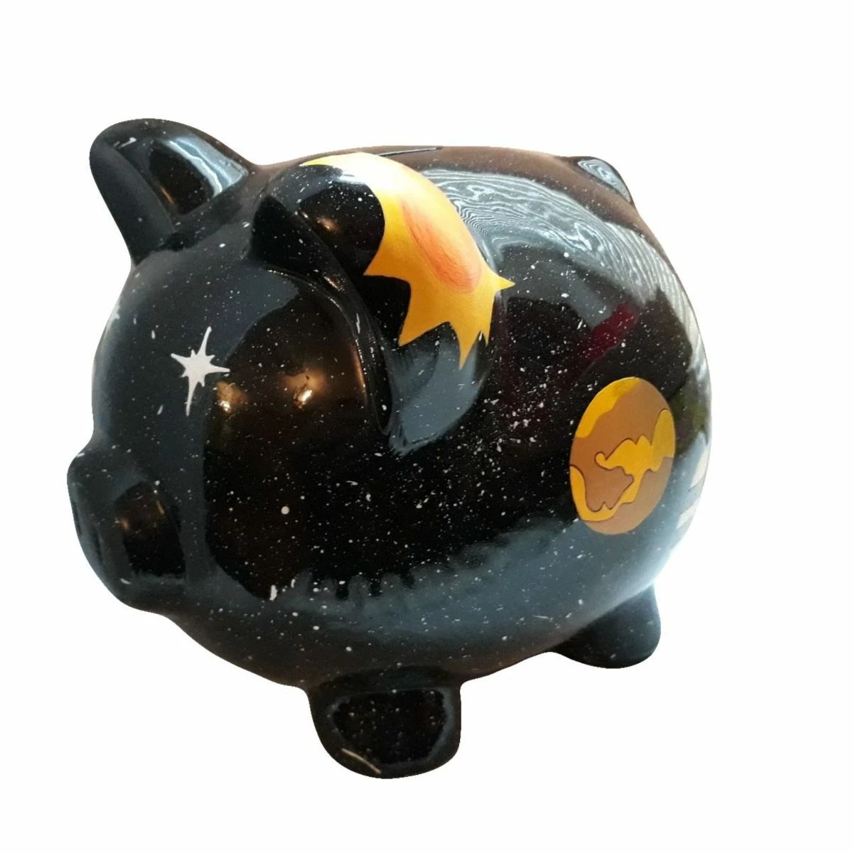 With stars as eyes, take a look at the different images. There’s a lot of the universe depicted on this pig as you look around. Pig has stopper in bottom of belly for easy removal of savings.