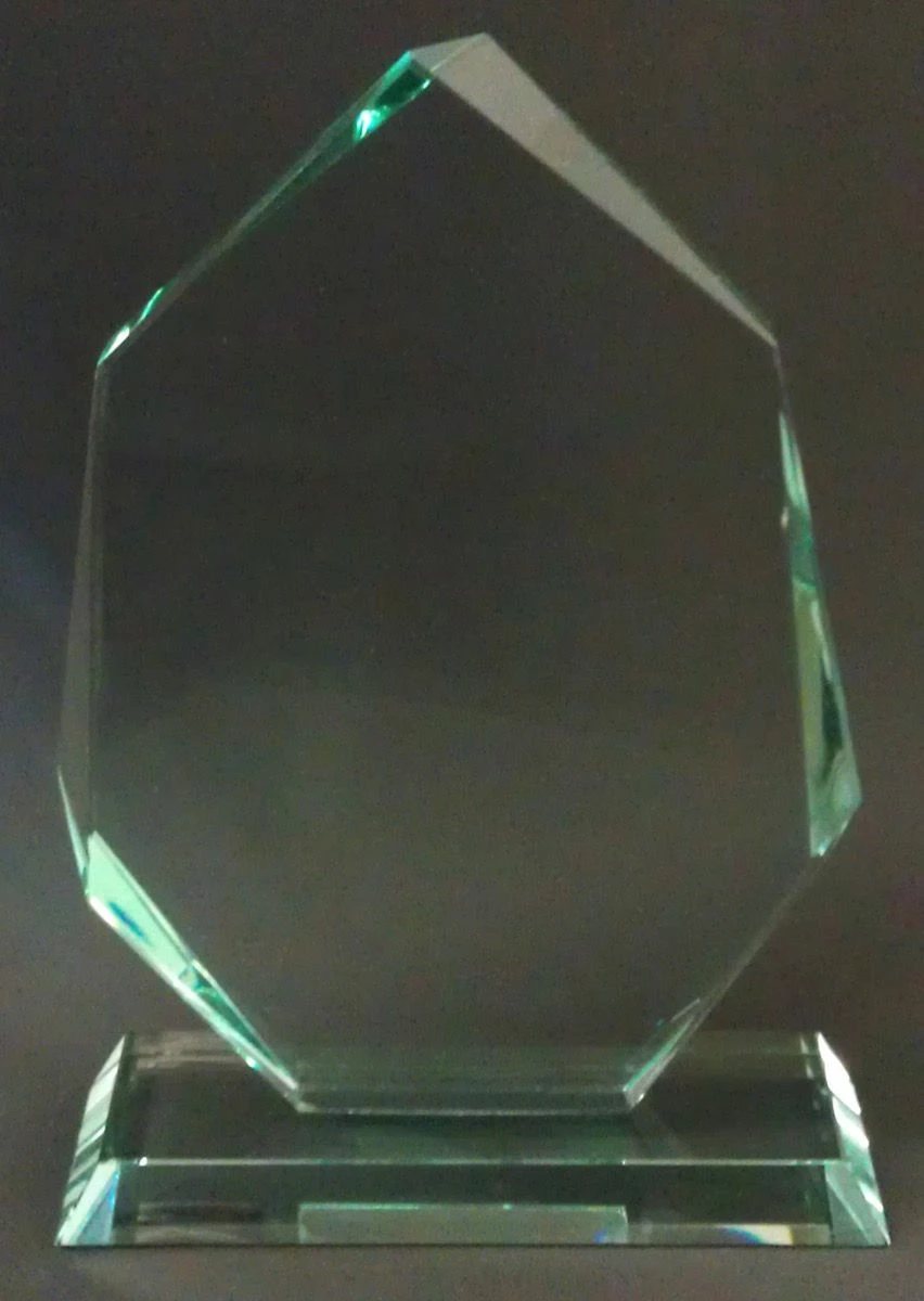 With facet cut edges, this 11 inch high trophy provides lots of space for text, even a logo. It is made of jade glass.