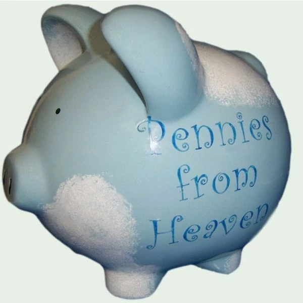When my Dad died, a friend gave me the poem, “Pennies from Heaven.” I began to pick up every penny I saw lying on the ground. I find it amazing that when I’m most troubled or the most indecisive I always seem to find a penny. One day I got out of my car at the warehouse – with a major problem I had to address. I couldn’t decide what to do. Twenty minutes later I went to get back in my car. There right next to the door were two pennies which were not there when I parked. My Dad was with me. I made the decision with what I perceived to be his help. I doubt if I’ll ever throw one of “Dad’s pennies” away; but I needed a place to keep them. So, this piggy bank was designed for me. I hope it will be as meaningful to you as it is for me.Â