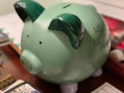 This piggy bank is a classic shape, but instead of being made of the easily smashed ceramic material, it is made out of a shiny metal. The industry used to use silverplate for banks like this; however, that has changed and now these banks have a nickel finish. The advantage of the nickel finish is that it does’t tarnish like the silverplate did. It is a very strong material, and if taken care of properly, this classic shiny piggy bank can last for years and years.