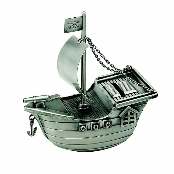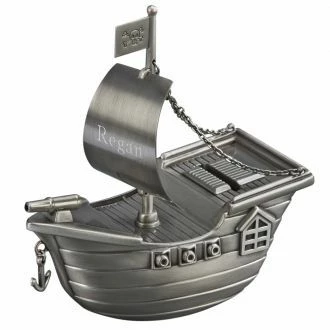 You can see the money slot on the back deck. It has a non-tarnish brushed pewter finish. Personalization is on the sail. Ships in a gift box.Â