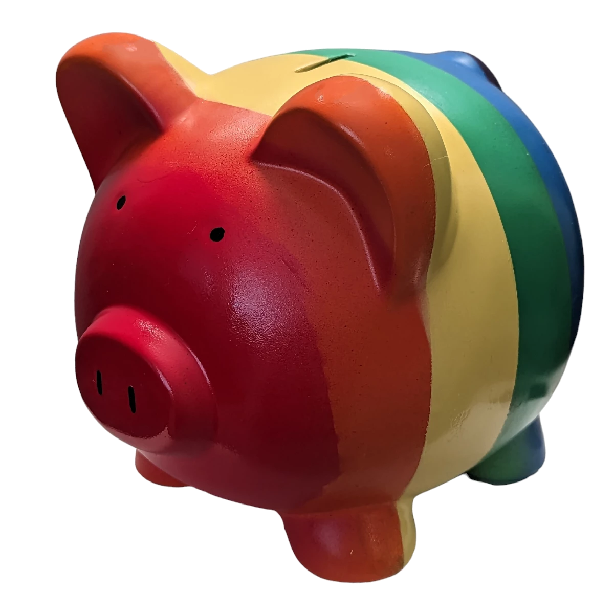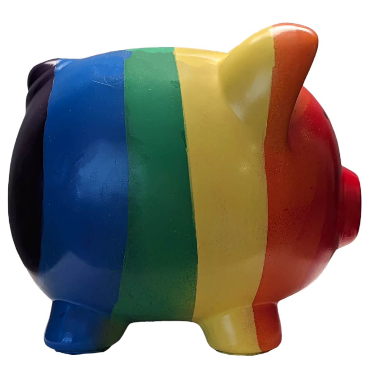 Yes, this pig is a rainbow piggy bank – with its stripes vertical. We also have a rainbow piggy bank with its stripes horizontal. The choice is yours.