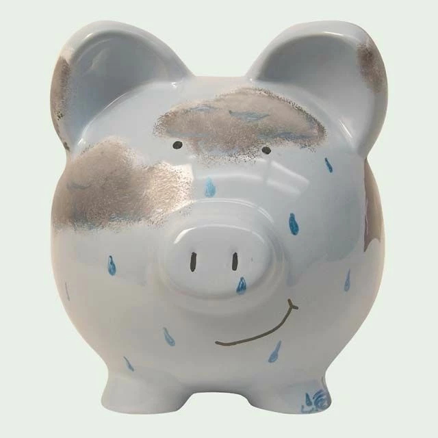 Be Prepared is a necessity for all of us – no matter our age. We all encounter storm clouds. You’ll note there are storm clouds on this pig. Love the face and the half smile under the storm clouds. Pig has plug on bottom of belly.Â