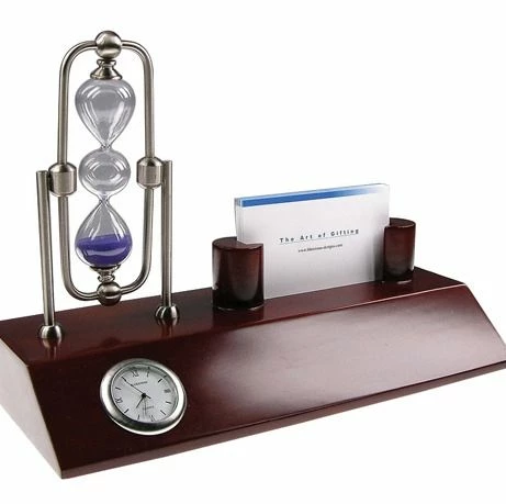 This unique desk organizer includes a clock and a business card holder. The surprise ingredient of this desk organizer is the Sand Timer. A simple way to time a “minute or two.” How many times have you said “give me a minute” !!!! Have fun.