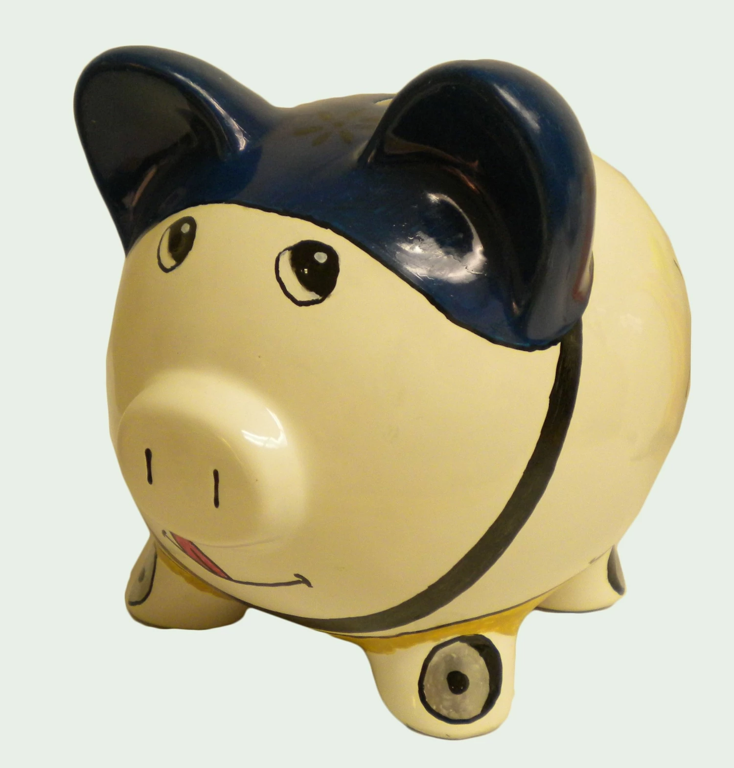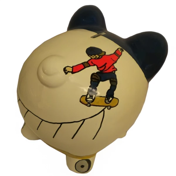 This great skateboarding piggy bank comes ready to have fun with a big smile on his face, a blue helmet, a skateboard with a wheel on each foot and skateboarder on the back riding a rail. As the mother of two boys, our artist knows lots about skateboarding. Skateboarding is fun and also a form of transportation. I’ve seen surfers on the way to the beach on a skateboard, carrying their surfboard!Â
