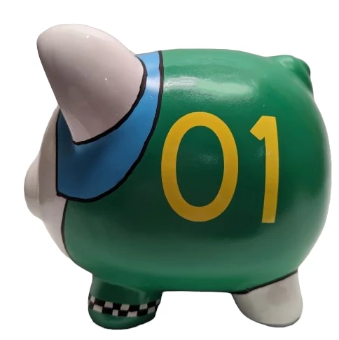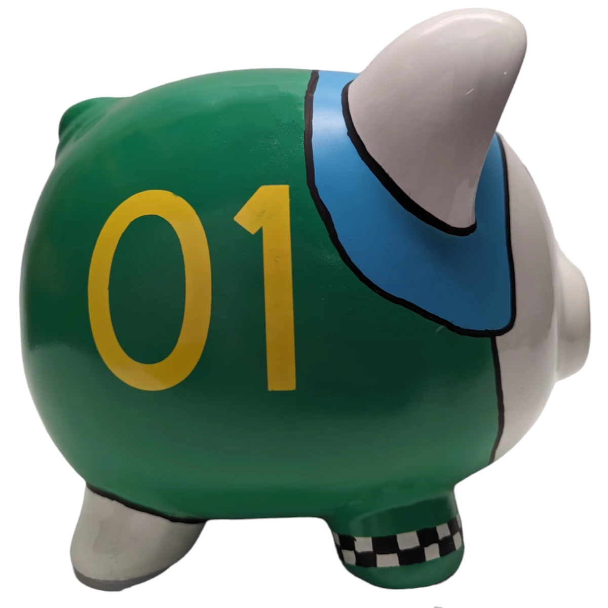 Our artist, has captured the spirit of a racer on the pig with colorful attire. Could be any activity whether it’s a track event, a car event, or even heading off to college or a new career. We can specialize the pig even more if you have an idea you’d like to add.